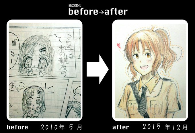 この方達のビフォーアフターイラストを拝見しましたが、「落書き」で500枚描くよりも比べ物にならないほど画力が上達しています。 ここまでいかずとも、落書き風イラストよりも本気絵イラストをコツコツ描いた方が、より効果的に思えます。 余裕のある方は、「本気絵500枚練習」の方が効率的に画力が上がりそうですね。 まとめ いかがだったでしょうか? 今回は、イラスト練 Twitterの皆さんのイラストの変化「#画力変化ビフォーアフター」が凄すぎる! 16年3月26日 ポコペン 1 Comment Categories アニメ 漫画 イラストを描き始めた頃や、数年前に描いたイラストと、現在のイラストを比べた「画力変化ビフォーアフター」が凄い! 数か月前のモノでもかなりの進化をしているモノもあり、衝撃的です。 ツイッターより #画力変化ビフォーアフター 14